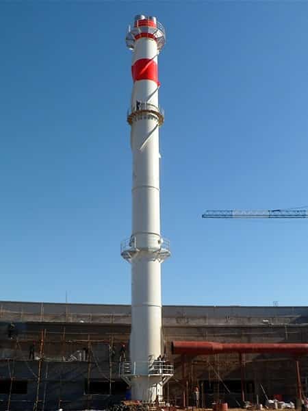 6雙層不銹鋼煙囪安裝方便:煙囪段在車間制作,現場拼裝,簡化了安裝程序,保證了煙囪內襯、保溫層、殼體等多個環節的制造質量問題,保證了工程質量。